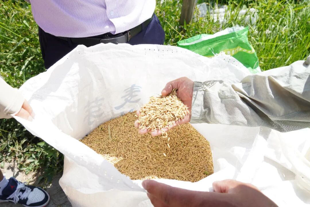 测产验收现场,专家组人员对取样田块进行机械收割、面积丈量、水分测定等全流程验收操作,经过装袋、称重等环节,折算结果均达到预期。